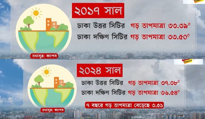 গত সাত বছরে রাজধানী ঢাকার তাপমাত্রা বেড়েছে সাড়ে তিন ডিগ্রি। গবেষণা সংস্থা ক্যাপসের জরিপে দেখা যায়, ২০১৭ সালে রাজধানী ঢাকায় গড় তাপমাত্রা ছিল ৩৩ দশমিক ০৪ ডিগ্রি সেলসিয়াস। চলতি বছর তা ৩৬ দশমিক ৯৬। বৈশ্বিক উষ্ণতা সেখানে ভূমিকা রাখলেও স্বেচ্ছাচারী নগর পরিকল্পনাই এর তাপবৃদ্ধির অন্যতম কারণ।